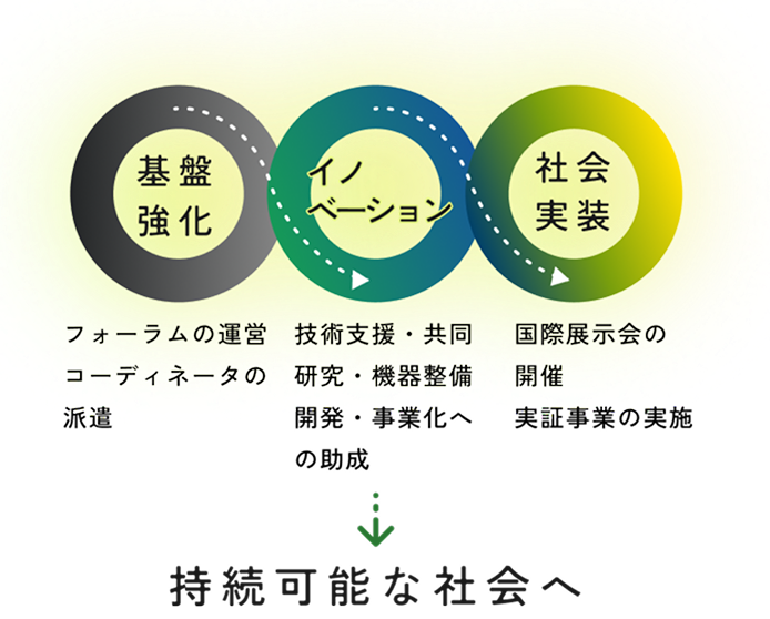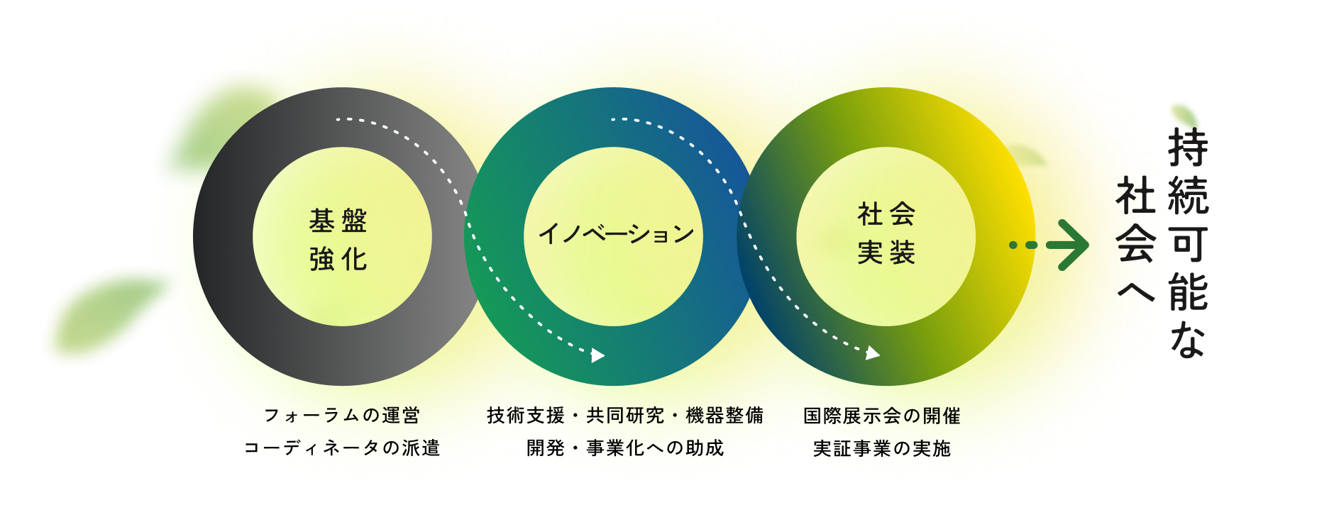 産学官の連携を通じて、「基盤強化」「イノベーション」「社会実装」の3本の柱を中心に地域発の循環経済モデルの実現を目指しています。