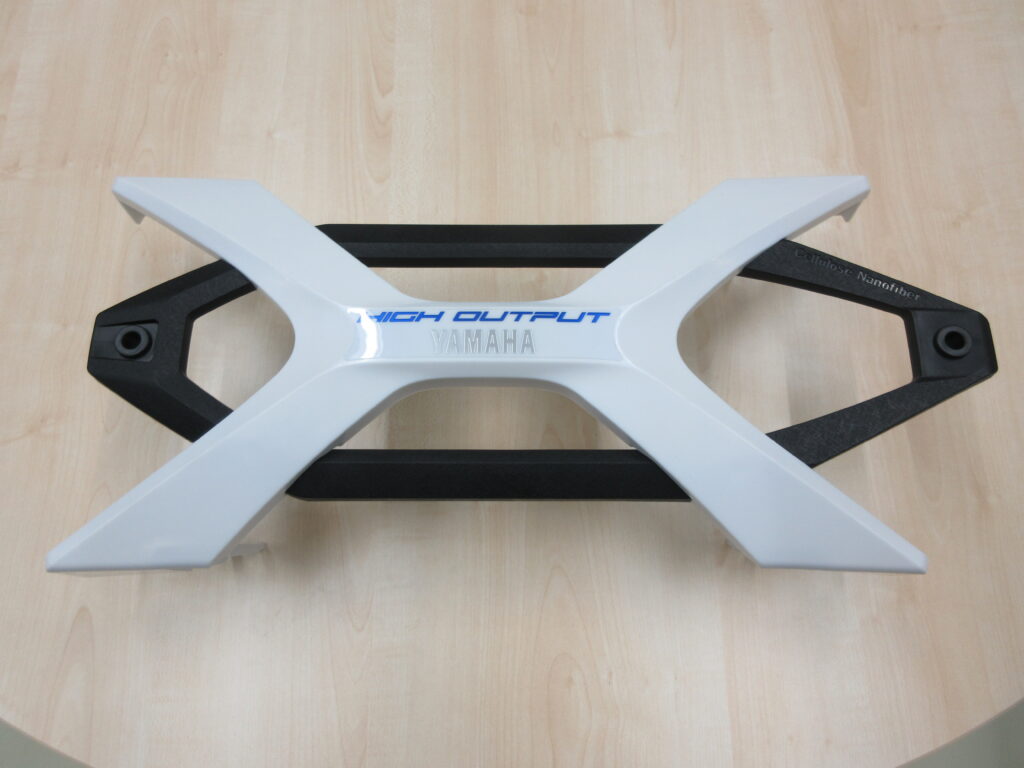 本製品は、セルロースナノファイバー(以下、CNF)を用いた射出成形材料により製作された、水上オートバイ用エンジンカバーです。 CNFを活用した輸送機器部品の量産化は、世界初の事例となります。 |