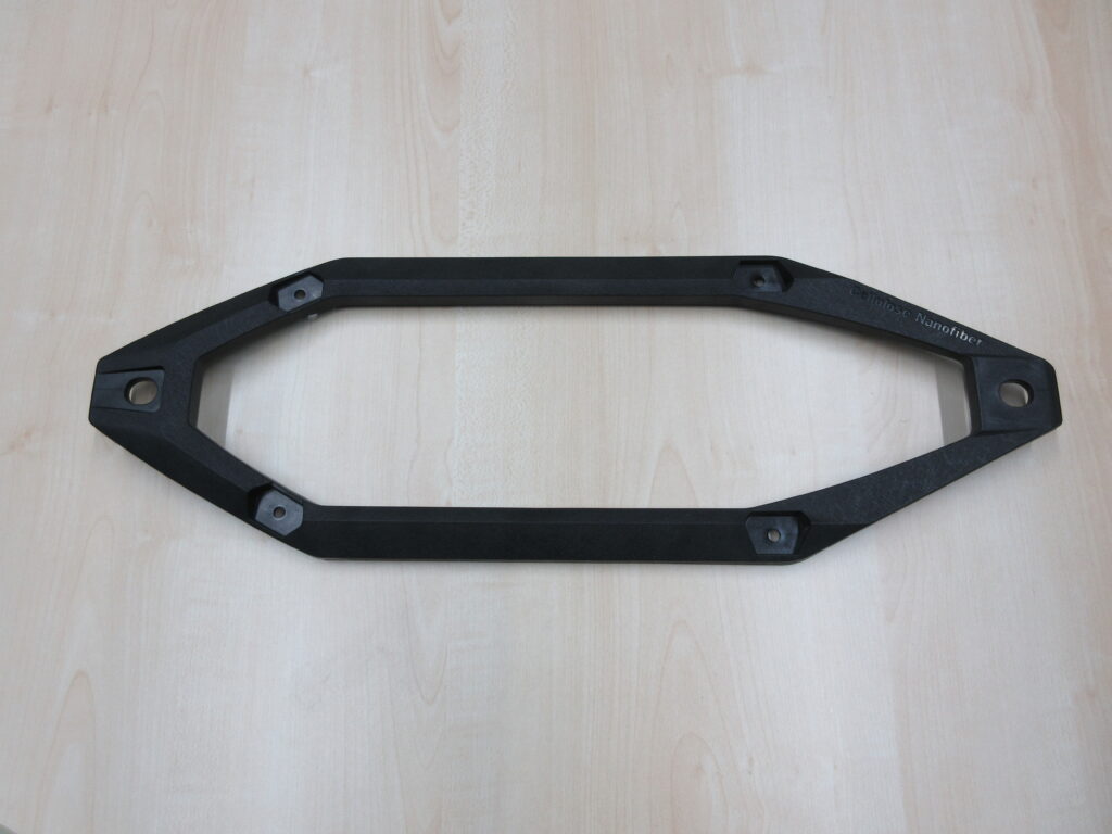 現在、使用済みのガラス繊維複合樹脂は、最終処分やリサイクル性に課題を抱えています。 当社はこれらの課題に対し、セルロースナノファイバー(以下、CNF)に着目し、2015年より静岡県の「ふじのくにCNFプロジェクト」を通じて、異業種である日本製紙株式会社と協業開発を開始しました。 開発の成熟と環境意識の高まりとチャレンジ精神が相まって、本部品への採用が決定。既存材料と比較して比強度が向上し、約25%の軽量化を実現。さらに、デザインの工夫により材料使用量も削減し、環境負荷の低減に貢献しています。 CNFは、天然素材由来であることに加え、素材製造時のCO₂排出量が少ないだけでなく、リサイクル性にも優れており、資源循環型社会の実現に向けた有望な材料として、今後も積極的に活用を推進してまいります。 |